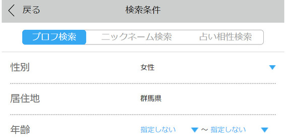 の2つを検索することができますが、プロフィール検索と同様に「群馬県」の「市」まで選択可能です。