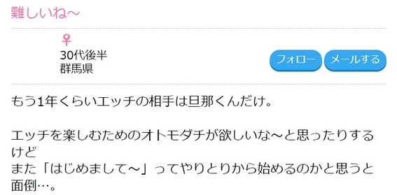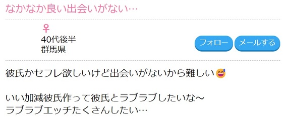 ハッピーメールには群馬に限らず多くの男女が不倫相手やセフレを探している投稿があります。