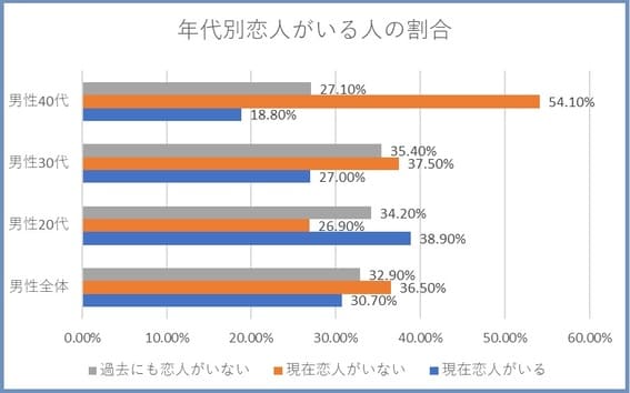例えば、男性全体で「現在恋人はいない」と「過去にも恋人がいない」の合計は69.4%になります。