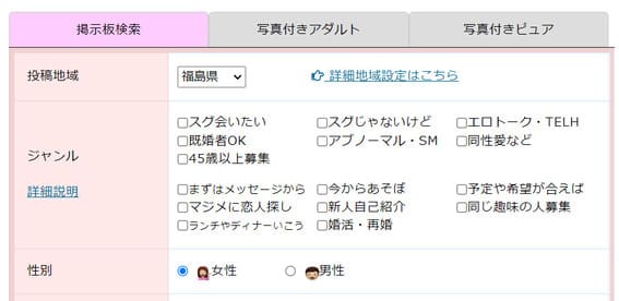 「アダルト 掲示板検索」または「ピュア 掲示板検索」から「詳細地域設定はこちら」に進み