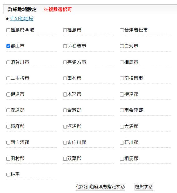 「福島県」「郡山」を選択しますが、「複数選択可」となっていますので
