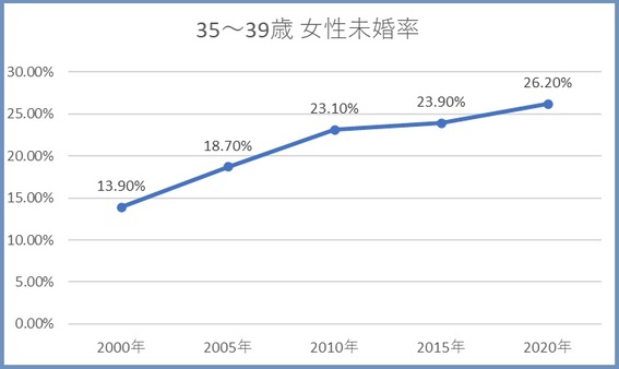 36歳独身の女性が該当する35~39歳の女性の独身率も高くなる傾向にあることが分かります。