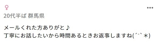| 丁寧なメッセージ | 初めてのコンタクトでは、 丁寧で親しみやすいメッセージを送るように心がけましょう。 ただし、相手のプロフィールを よく読んでからメッセージを送るのが大切です。 |
